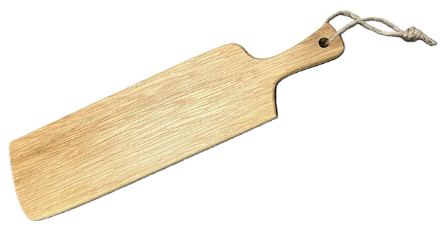 Prachtig kaasplankje van Re-oak. afmetingen ca. 9x33cm. Deze kaasplank is gemaakt van hergebruikt eikenhout. Hout dat al een heel leven achter de rug heeft. Door het grote handvat, ligt deze plank fijn in de hand. Serveer smakelijke kazen, worst of andere hapjes.